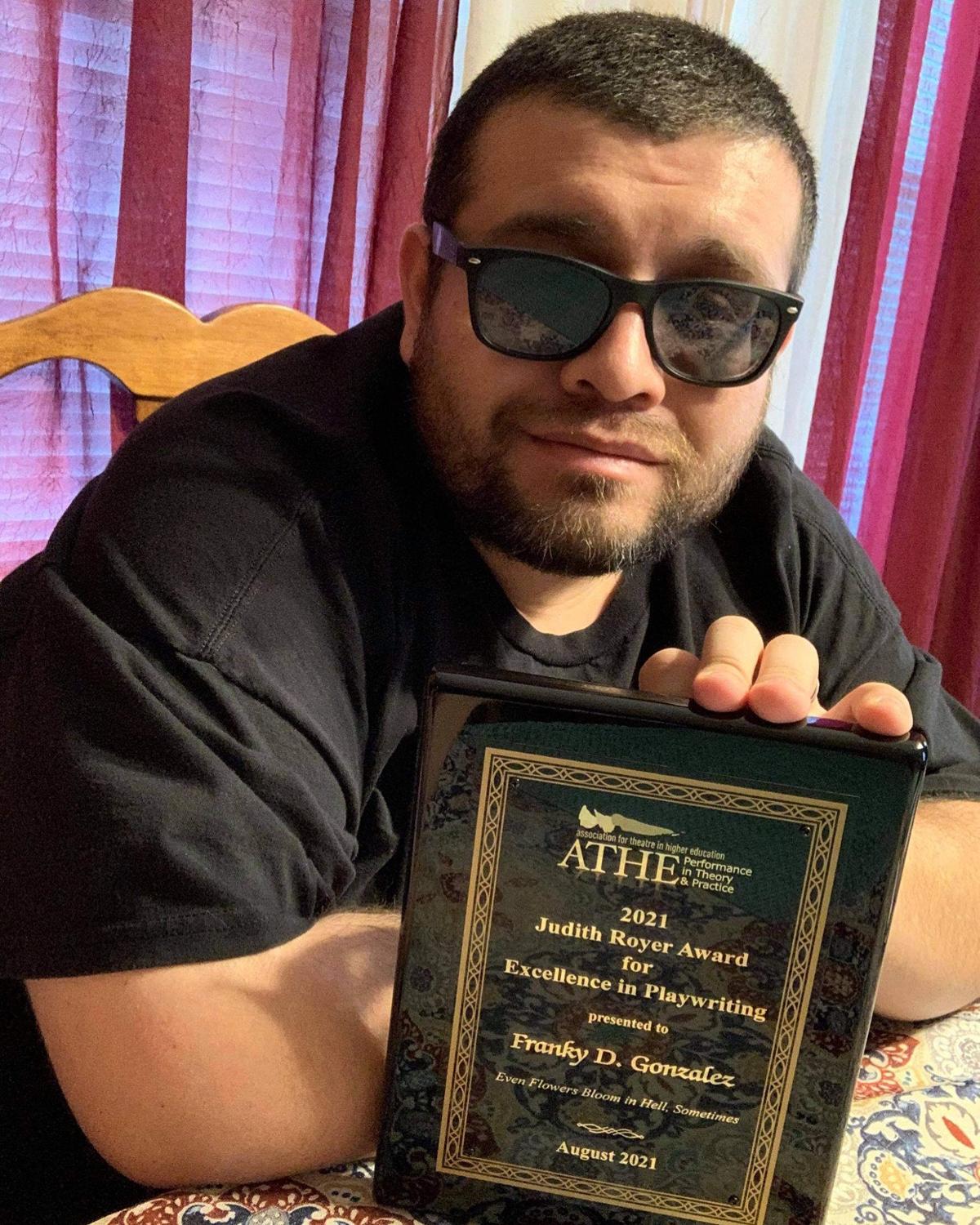 Franky D. Gonzalez, Los Angeles, California, has been awarded the 2021 Judith Royer Award for Excellence in Playwrighting from the Association for Theatre in Higher Education. In his speech, Franky thanked many faculty and staff members from the Department of Dance and Theatre and dedicated his award to retired professor Andrew B. Harris. Franky, a theater major, served as the Dramatists Guild Regional Representative in 2018 for the Dallas-Fort Worth region. He has worked with the Sundance Institute, the Ojai Playwrights Conference, the Great Plains Theatre Conference and more. Franky also served as a staff writer for the fourth season of the Netflix show 13 Reasons Why and has been a finalist at a variety of conferences, including the Playwrights Realm Scratchpad Series and the New Dramatists residency. He also has been named the 4 Seasons Resident Playwright, a Sony Pictures Television Diverse Writers Program Fellow and a Core Writer with the Playwrights’ Center.