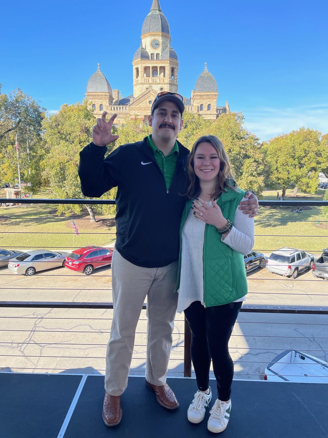Jacob Flores (’14), Fort Worth, proposed to Andrea Plum (’16, ’21 M.Ed.) on the downtown square before attending the Homecoming football game last year. They met on Bumble, but Andrea said it was his pictures of him traveling to UNT games that caught her eye. “Our first conversation on Bumble involved discussing the football team in great length,” she says. “The first text he ever sent me was ‘North,’ to which I smiled and responded ‘Texas.’” Their first date was at LSA Burger in 2019 — and they celebrated their engagement there. They plan to get married November 2022. “Denton will always be such a special place for us, so we could not imagine getting married anywhere else,” Plum says. “UNT and the city of Denton will always be intertwined in our love story in so many ways!”