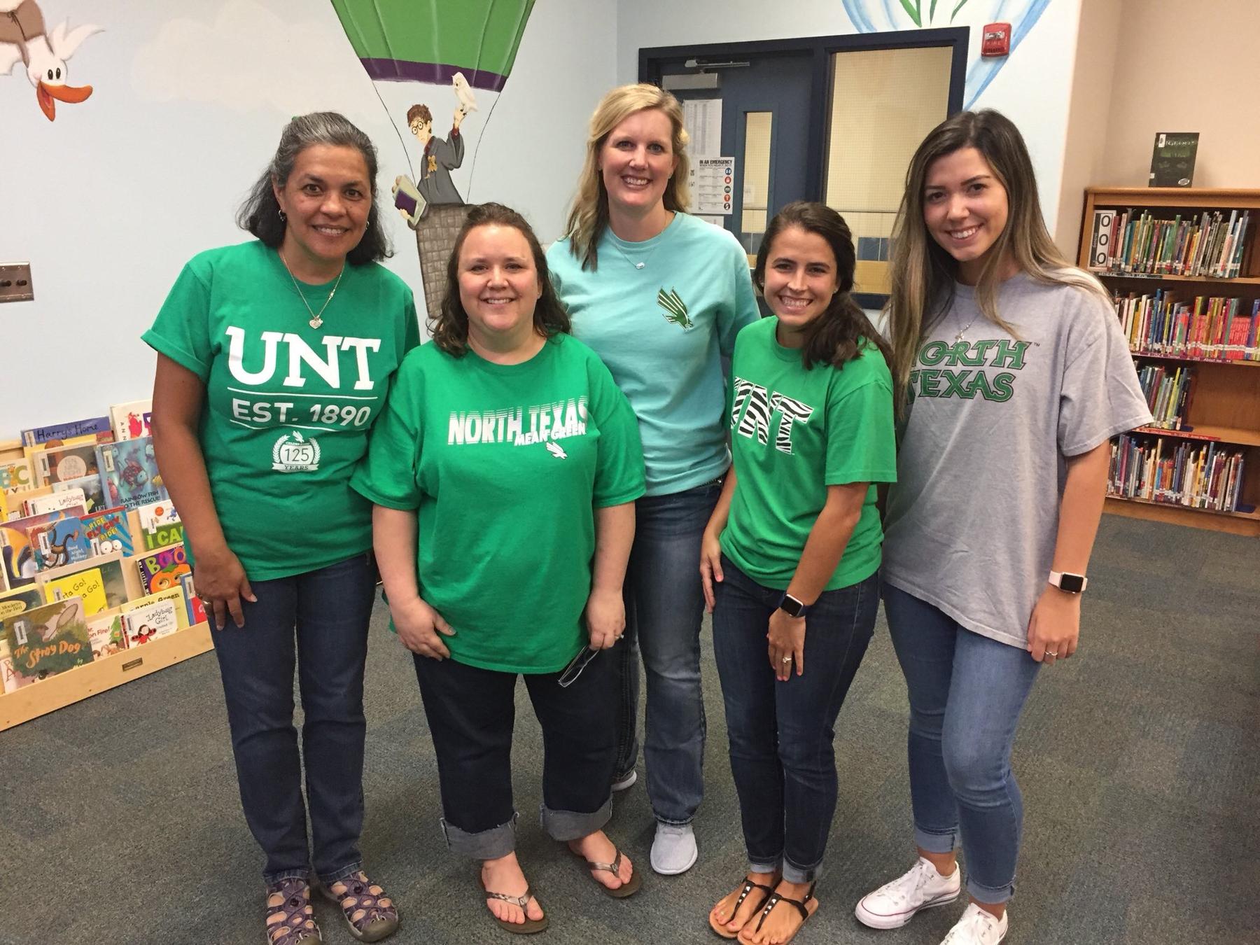 Teachers at Silver Lake Elementary School in Grapevine-Colleyville ISD represented UNT as a way to recruit students on National College Colors Day, which took place Aug. 31. They are (from left to right) Leonor Morales ('09), Tovah Rasoi ('13), Becky Sporrer ('99), Hannah Flanagan ('14), and Alyssa Wendt ('17)