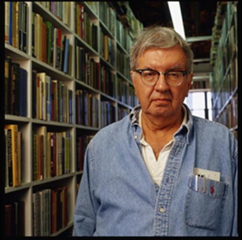 Larry McMurtry wears a blue shirt and stands in front of rows of bookshelves.Larry McMurtry (’58), 84, an award-winning novelist and screenwriter, died March 25 at his home in Archer City.
